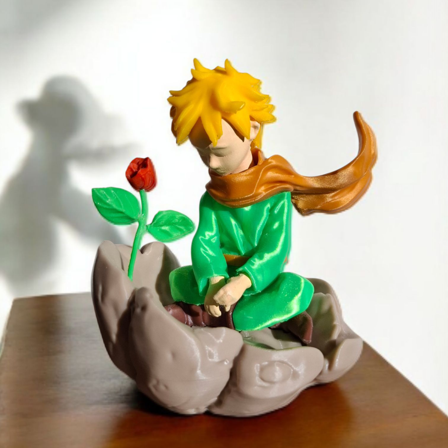 طراحی الهامگرفته از داستان شازده کوچولو تولید شده با تکنولوژی پرینت سهبعدی با دقت بالا پرداخت جزئیات ظریف در لباس، مو و گل رز رنگآمیزی هنری و چشمنواز سبک دکوراتیو، مینیمال و مفهومی مناسب هدیه، کلکسیون و دکور خاص